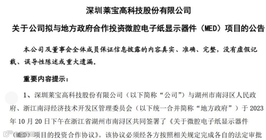 10月 20 日,深圳莱宝高科技股份有限公司公告,莱宝高科与湖州市南浔区人民政府、南浔经济技术开发区管理委员共同签署《关于微腔电子纸显示器件(MED)项目的投资合作协议》,项目总投入90亿元。