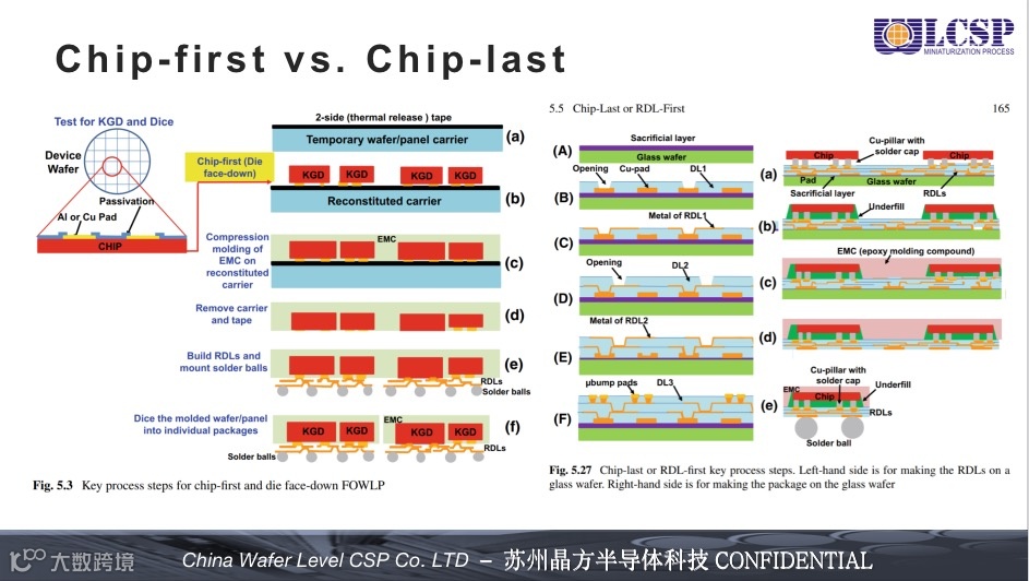 扇出结构通过重布线技术层(RDL)来实现芯粒的扩展布线,结构可分为两类:chip-last和chip-first。两者的差别主要在于先晶粒放置后制作RDL层,还是先制作RDL层再键合晶粒,主要制程包括晶圆重置,RDL层,EMC塑封,倒装等工艺。“chip-first”被英飞凌Infineon,日月光集团ASE等公司广泛使用,eWLB就是代表性封装形式之一。