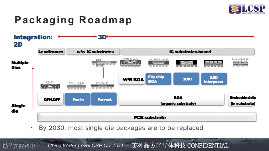 在超越摩尔(Packaging Scaling)的路线上,封装微缩侧重于功能解耦和高密度集成。例如,在一个异质集成系统中实现提升性能的数字处理器/存储模块以及其他模块集成,集成度的提高通过封装技术来实现,而不是将更多功能用同一CMOS工艺在同一晶圆上缩微到同一块芯片中,从而通过封装微缩实现系统级封装SiP。