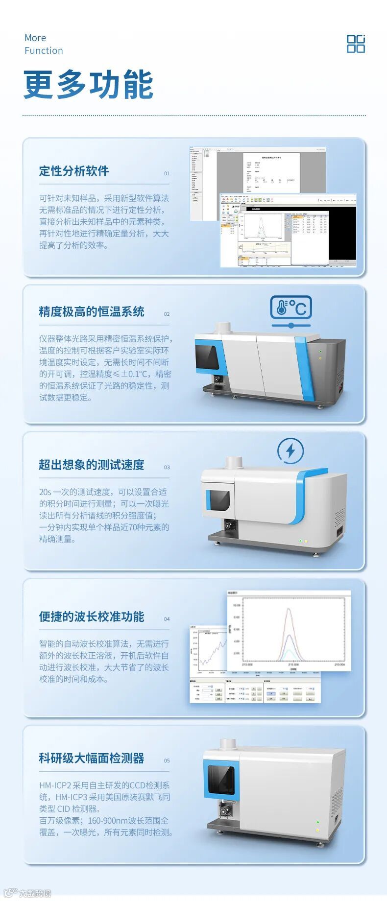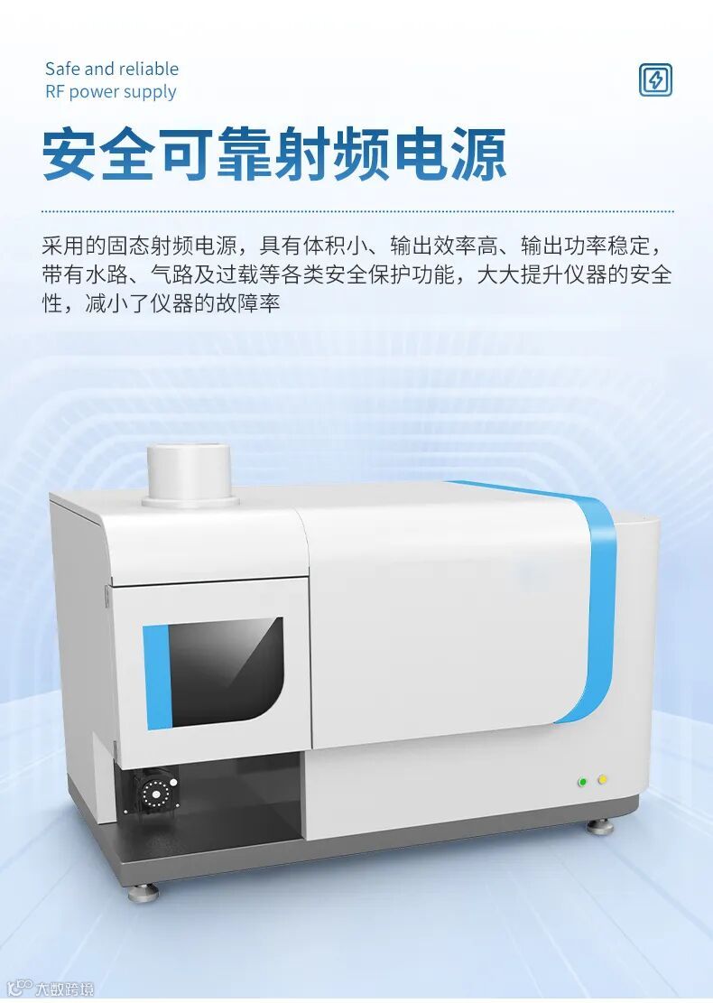 电感耦合等离子体发射光谱仪是以高灵敏度光电倍增管为检测器的微量元素成分分析测试仪,测试近70余种元素,拥有固态射频发生器、自动调谐匹配技术;配置专用循环冷却水系统、氩气导管、冷却水管、高灵敏度进样系统(高效雾化器加双筒型雾化室)。