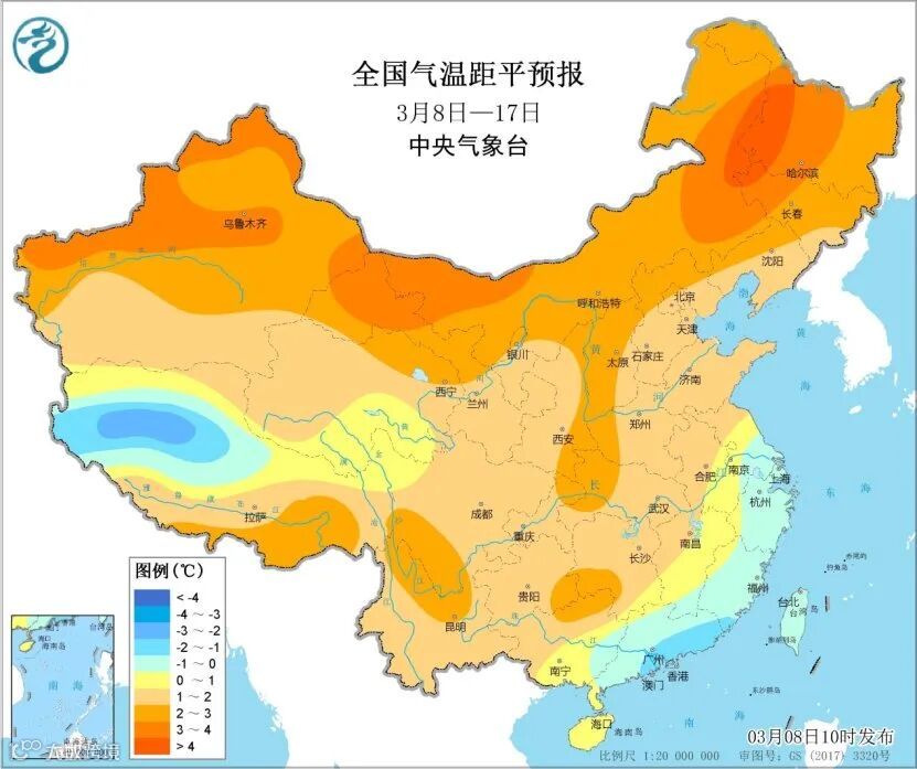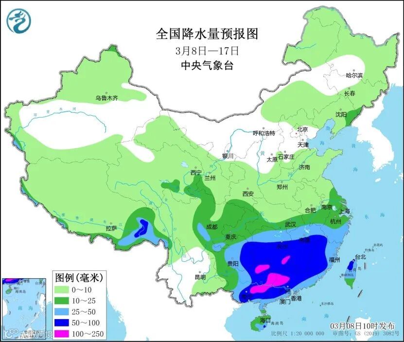 未来10天(3月8-17日),江南大部、华南大部、贵州东部及西藏东南部等地累计降水量有30~60毫米,江南南部、华南中北部等地部分地区80~120毫米;新疆北部、西北地区中东部、华北北部、东北地区东部、黄淮东部等地部分地区累计降水量有3~8毫米,局地超过10毫米,上述大部地区降水量较常年同期偏多4~7成,局地偏多1倍以上。