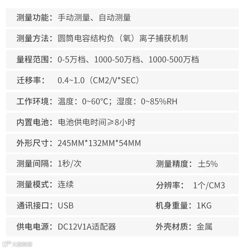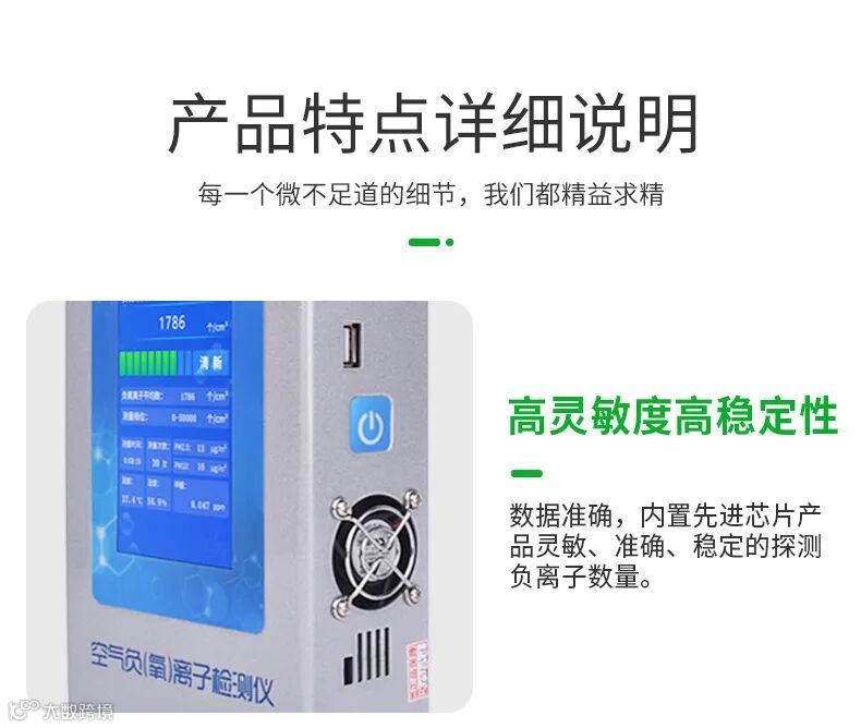 1、屏幕显示:5.0英寸电容触摸屏,800*480高分辨率,实时显示负(氧)离子测量结果;
