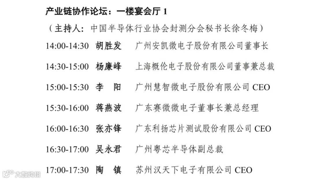 本次峰会特设产业链协作论坛,由中国半导体行业协会封测分会秘书长徐冬梅担任主持人,广州安凯微电子股份有限公司董事长胡胜发,上海概伦电子股份有限公司董事兼总裁杨廉峰,广州慧智微电子股份有限公司CEO李阳,广东赛微微电子董事长兼总经理蒋燕波,广东利扬芯片测试股份有限公司CEO张亦锋,广州粤芯半导体副总裁吴永君,苏州汉天下电子有限公司CEO陶镇先后登台发表了精彩的演讲,共同探讨产业链系统创新的机遇。