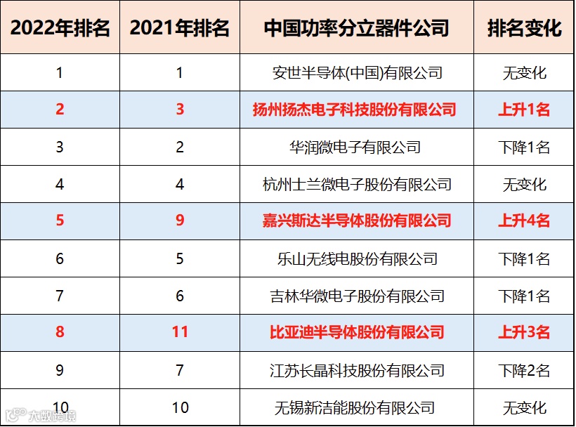 2022年中国功率分立器件行业前10公司营收与排名
