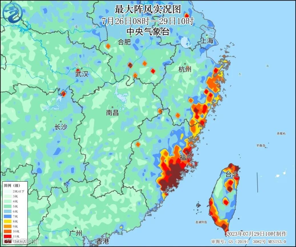 台风影响期间,福建、安徽共计有6个国家气象观测站日降水量突破历史极值;福建共计有7个国家气象观测站极大风突破历史极值。