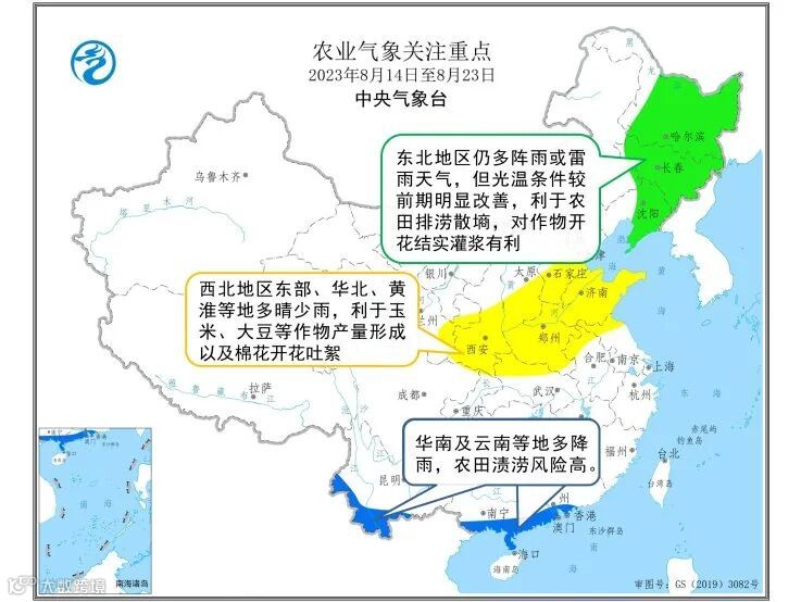 预计未来10天(8月14日-8月23日),东北地区仍多阵雨或雷雨天气,但光温条件较前期明显改善,利于农田排涝散墒,对作物开花结实灌浆有利。西北地区东部、华北、黄淮等地多晴少雨,利于玉米、大豆等作物产量形成以及棉花开花吐絮。未来10天,华南、四川盆地、云南西部和南部、青藏高原等地多降雨,部分地区累计降水量有80~150毫米,降水过程主要集中在16-18日,农田渍涝风险高。未来10天,中东部无大范围持续性显著高温天气,江淮、江汉、江南等地有中到大雨,利于湖南、安徽前期缺墒田块改善墒情(图4)。