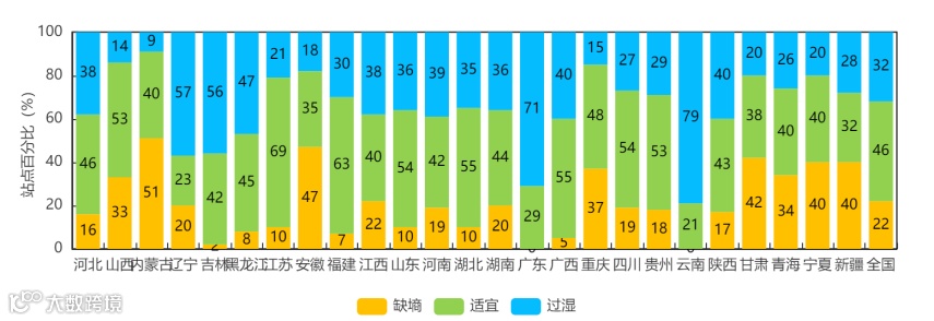 附图2 8月12日分省20厘米土壤墒情统计(站点百分比)