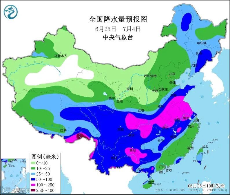 未来10天(6月25日-7月4日),江汉、江淮、黄淮南部、江南北部、华南西部以及西南地区东部和南部等地累计降水量有60~110毫米,其中苏皖、河南南部、四川盆地东部以及西藏东南部等地的部分地区有150~200毫米,局地250毫米以上;上述大部分地区降水量较常年同期偏多5成至1倍以上。另外,内蒙古东部、东北地区、西北地区东南部、青海大部和新疆北部等地累计降水量有20~40毫米,局地有50毫米以上。