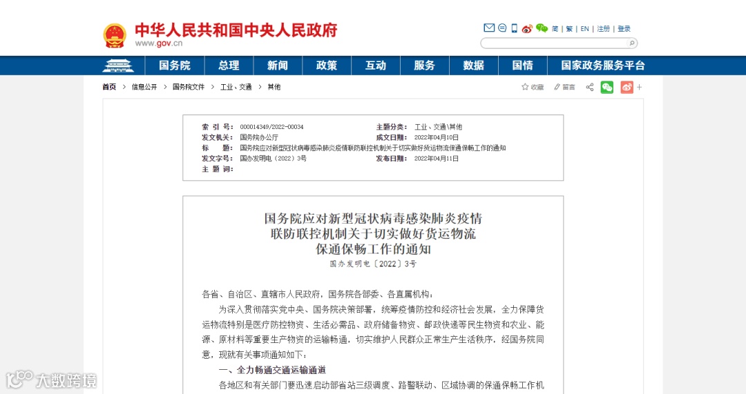 为深入贯彻落实党中央、国务院决策部署,统筹疫情防控和经济社会发展,全力保障货运物流特别是医疗防控物资、生活必需品、政府储备物资、邮政快递等民生物资和农业、能源、原材料等重要生产物资的运输畅通,切实维护人民群众正常生产生活秩序,经国务院同意,现就有关事项通知如下:
