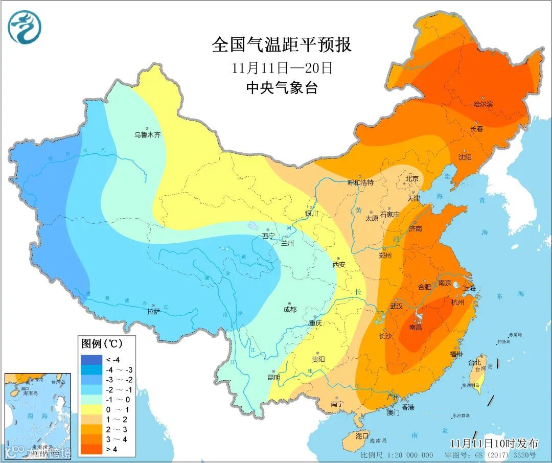 未来11-14天,中东部地区平均气温接近常年同期或偏高1~2℃,西藏、新疆等地气温偏低1~2℃。