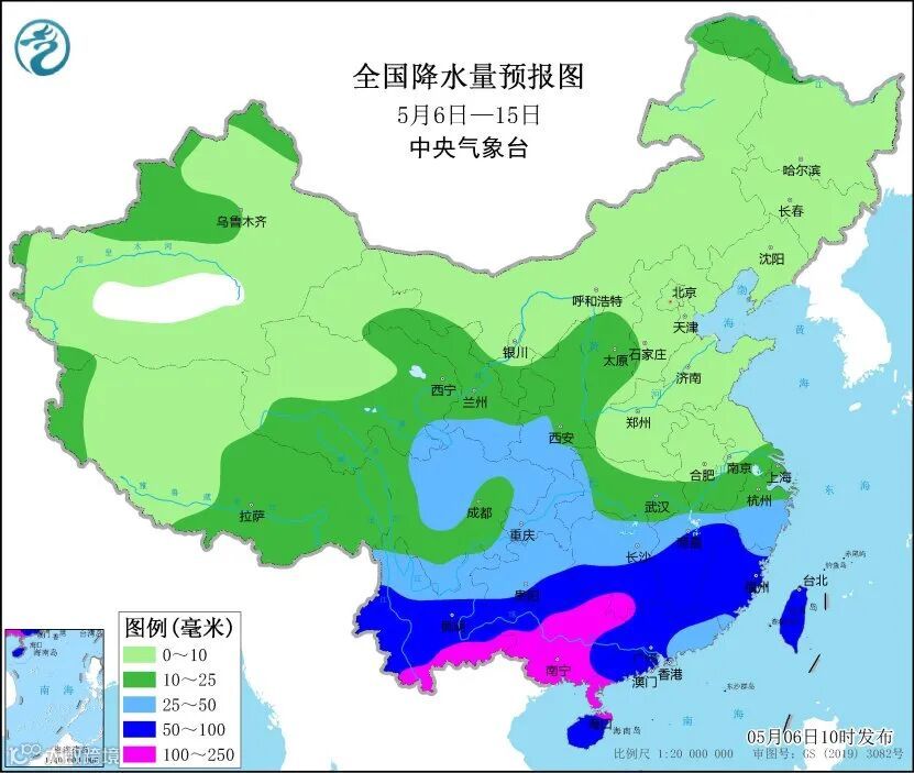 未来10天(5月6-15日),江南中南部、华南大部及贵州、云南中南部等地累计降水量有40~60毫米,部分地区有70~150毫米;西北地区东部、青藏高原东部累计降水量有15~30毫米; 与常年同期相比,云南、广西西部等地降水量较常年同期偏多2~6成,局地偏多1倍以上,西北地区东部、青藏高原东部基本接近常年,我国其余大部地区降水量较常年同期偏少。