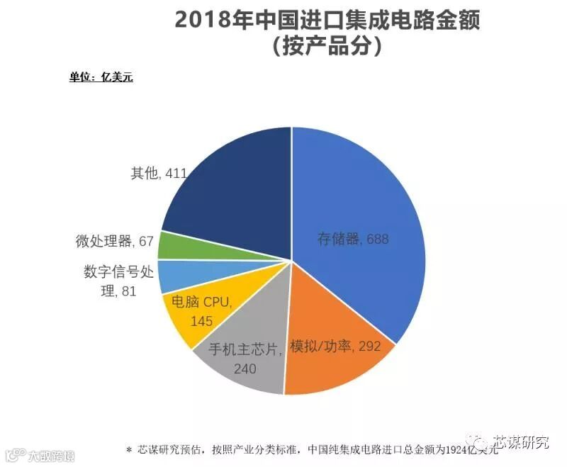 更具有现实意义的是,进口数字的增长表明进口替代的空间很大,进口产品的结构也为国内企业提供了指引。芯谋研究预估2018年进口纯集成电路进口额1924亿美元,并分别进行估值拆分如下。