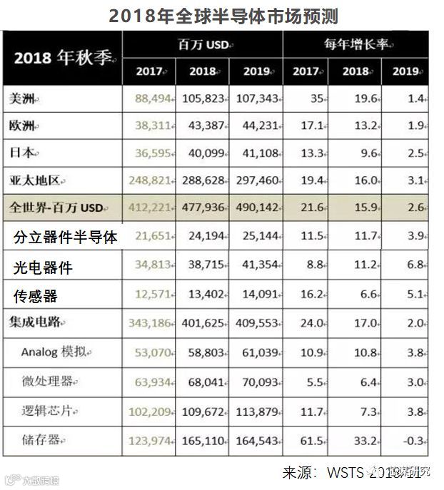 根据WSTS(世界半导体贸易统计)发布的最新数据,2018年全球半导体市场规模为4780亿美元,其中集成电路4016亿美元,亚太区(日本除外)半导体2886亿美元(WSTS将半导体分为分立器件、光电器件、传感器和集成电路四大类)。