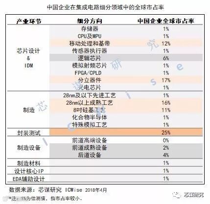 我们进一步对中国企业在全球集成电路产业链的细分领域占比进行分析,更加暴露出我们半导体产业链的不足。