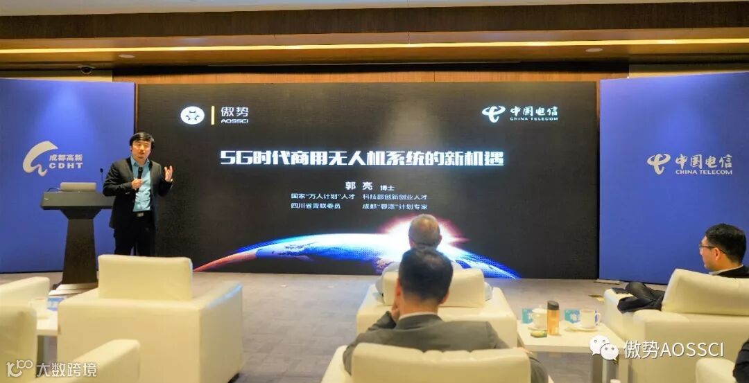 ↓ 大会现场,傲势CEO郭亮博士在论坛上作《5G时代商用无人机系统的新机遇》主旨演讲。