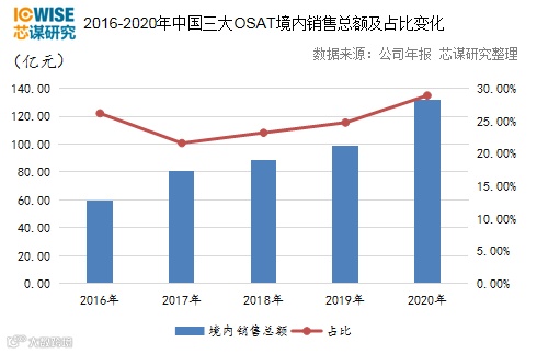 芯谋研究数据显示,2020年中国封测产能持续扩张,通富微电苏通厂二期、华天科技南京厂等主要封测代工厂新产线逐步投产,中国封测代工厂市占率提升至22.95%。受益于国内设计企业规模及代工需求大幅提升,叠加疫情和国际贸易环境变化影响,2020年中国封测代工厂境内客户销售占比持续提升,达到29.35%,其中,三大封测厂合计境内客户占比达到28.92%,合计境内收入131.6亿元,同比增长率高达33.48%,2016年到2020年五年间三大厂合计境内收入增长1.21倍。