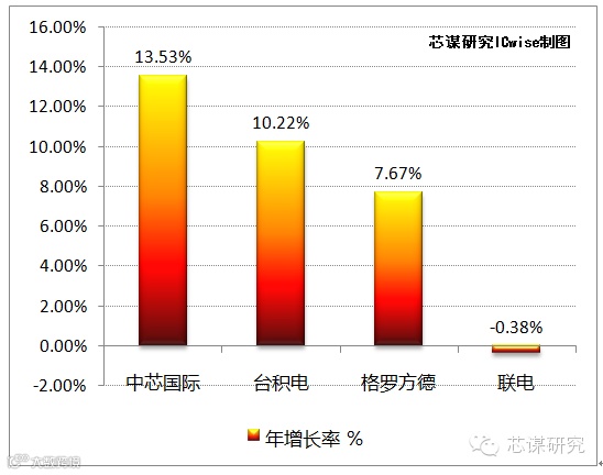 如果去年一年的增速不能说明中芯国际走在快速增长的路上,那从2011年以来,四大Foundry的年复合增长率,中芯国际还是高居第二。