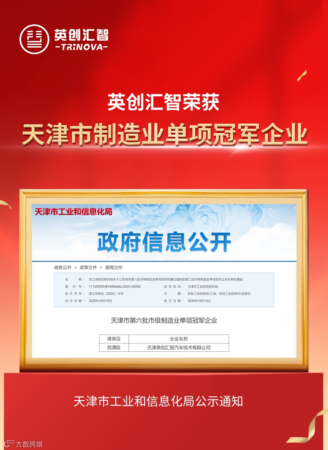 近日,天津市工业和信息化局正式公布《第六批市级制造业单项冠军企业名单》。英创汇智凭借在线控底盘领域的技术突破与市场领先地位,成功入选,荣获“天津市制造业单项冠军企业”称号。这不仅是政府对公司在细分行业领先地位的权威认可,也标志着我们在技术研发与市场竞争力方面迈上新台阶。