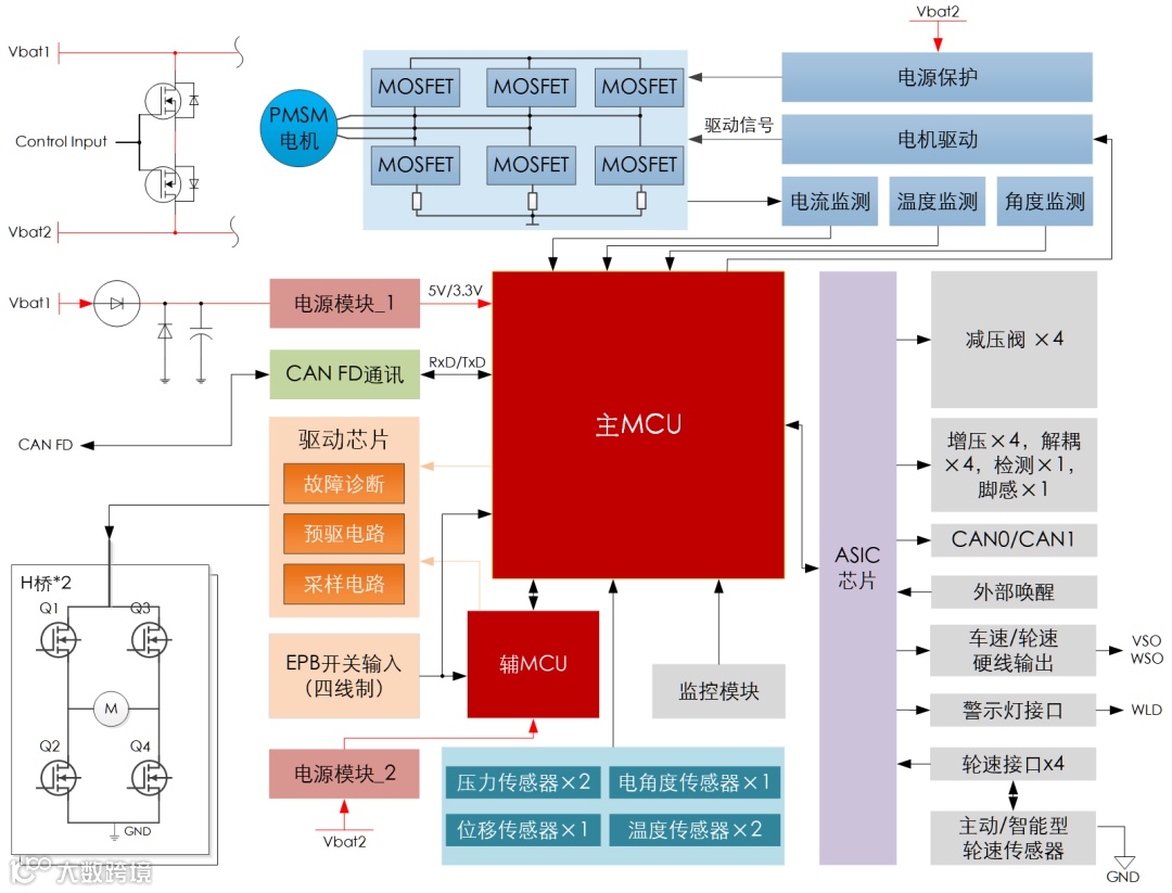 基于双MCU及冗余EPB的电控方案(如下图所示),整个方案采用了双路独立外部供电、双路外部CAN/CANFD通信以及冗余EPB控制。电机驱动单元、电机位置传感器、电源管理单元、主控MCU也都采用了双备份的冗余架构。主控MCU采用多核锁步的32位芯片,同时最高支持ASIL-D功能安全等级。双MCU都可实现完整的EPB控制及CAN通讯功能,上电初始化后默认分配主、从角色。如果系统发生单点失效,双MCU根据故障诊断与处理机制判断是否进行EPB的主从控制切换,必要时从系统切换为主控系统。