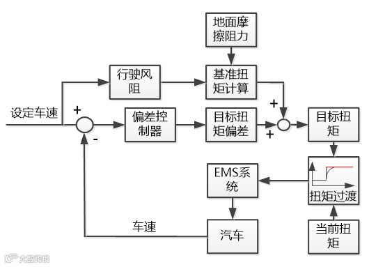 而根据车速和地面摩擦阻力可计算得到基准扭矩。基准扭矩和扭矩偏差组成目标扭矩,这样实际构成了前馈+反馈控制,提高了控制的响应速度和鲁棒性。为了减小超调,当前扭矩会平滑过渡到目标扭矩。平滑后的目标扭矩通过CAN总线传送到EMS系统,实现车速的控制。