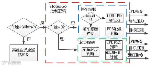 当车速低于30km/h时,进入ACC的Stop&Go控制逻辑,实现在交通拥挤路况下的车辆启停。此时ACC控制的最大减速度变为-6m/s²。