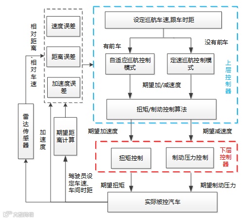 其中自适应巡航系统(Adaptive Cruise Control,ACC)是一种可以高效缓解驾驶疲劳,提高道路车辆行驶安全性的主动安全技术。作为新一代辅助驾驶系统,它可以减轻长期的驾驶负担,还能有效减少错误驾驶和疲劳驾驶引发的交通安全事故,并在现有交通基础设施上增大道路交通通行能力,减少燃油消耗和废气排放。