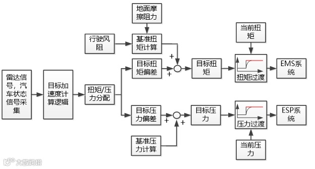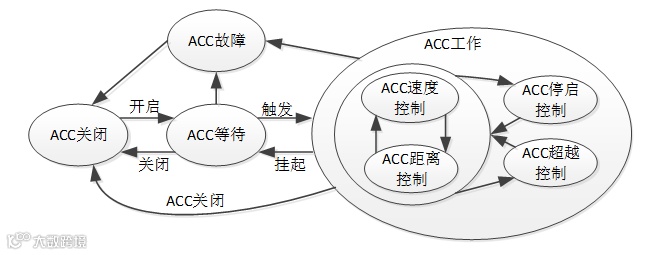 ACC等待状态:ACC系统没有参与车辆的纵向控制,但可随时被驾驶员触发而进入工作状态;