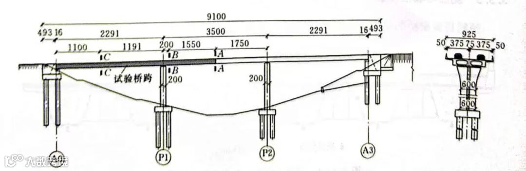 根据图1-4所示的桥梁内力包络图并结合相关规范要求,选取中跨跨中M+max(A-A截面)、墩顶附近M-min(B-B截面)、边跨M+max(C-C截面)3个断面作为此次荷载试验的控制界面,见图1-1