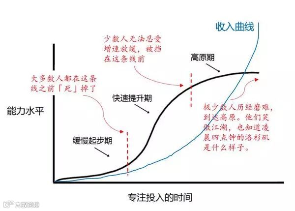所以,最后的结果是,在成才的道路上,大多数人都在缓慢起步期「死」掉了。小部分人爬到了快速提升期。而只有极少数人到了高原期,笑傲江湖。