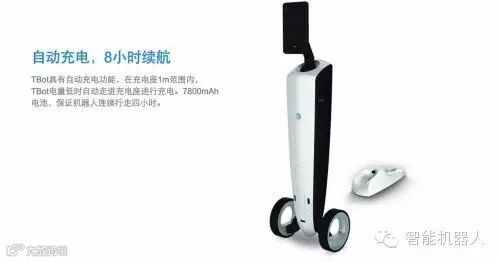TBot续航时间可达8小时。机器人还具有自动充电功能,电量不足时只需操作机器人行驶至距离充电座1米范围内,机器人便能自动驶入充电座开始充电。