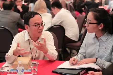 图1,长江商学院金融学教授、EMBA项目副院长梅建平博士在“第三届南加州中国论坛”现场与参会者交流