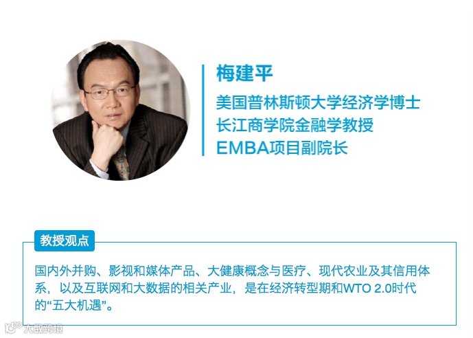 “国内外并购、影视和媒体产品、大健康概念与医疗、现代农业及其信用体系,以及互联网和大数据的相关产业,是在经济转型期和WTO 2.0时代的‘五大机遇’”,他说,“中国未来会面临不少破产重组和海外并购的机会,因此需要大量金融人才;医疗健康行业也急需人才,虽然目前它只占中国GDP的5%, 但未来会发展到15%至17%。文化创意行业则代表了一个国家的精神面貌,拥有14亿人口的中国预期将在2020年登上世界票房榜首;此外,拍出《功夫熊猫》、塑造出‘都教授’、培养能拿奥斯卡奖项的李安,让中国元素和创意进入全球主流文化圈,是中国文化创意产业未来发展的新趋势。“