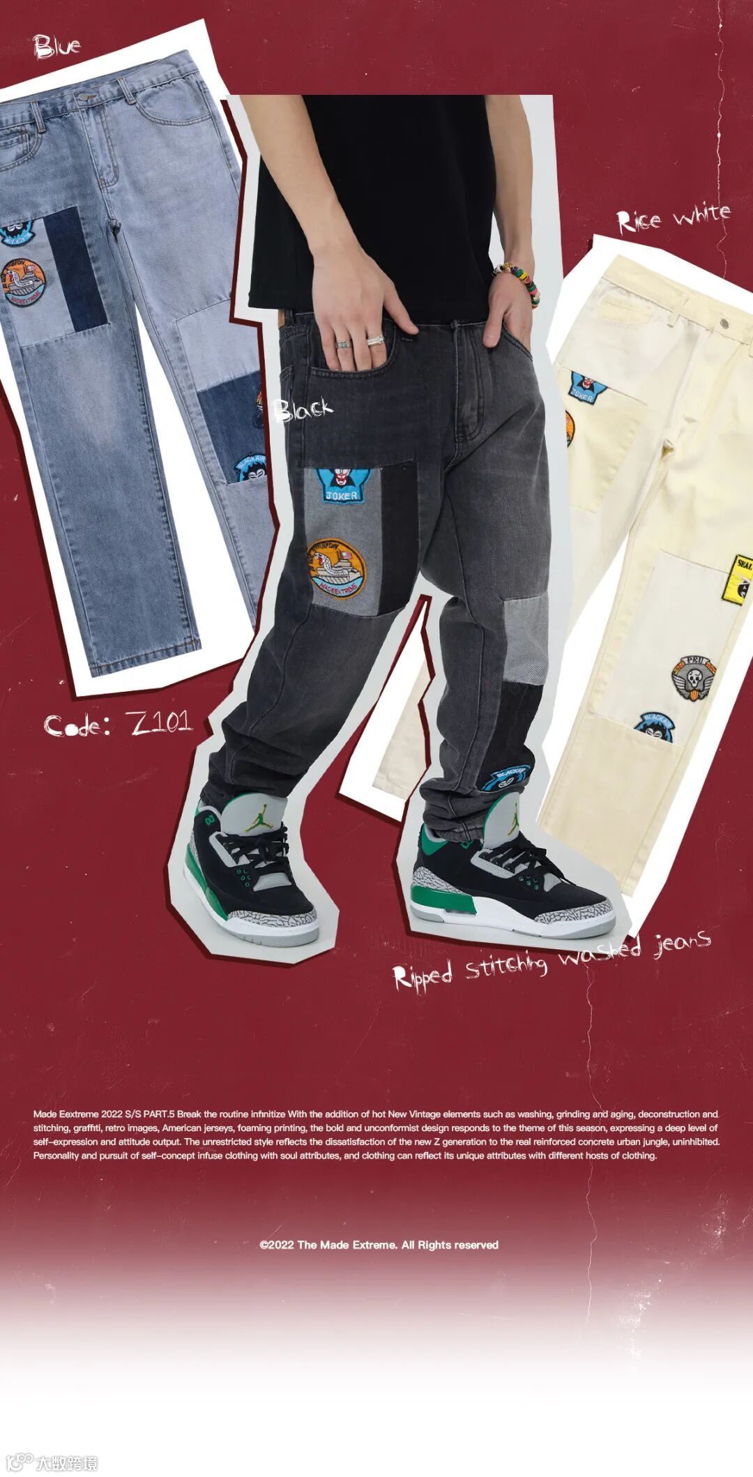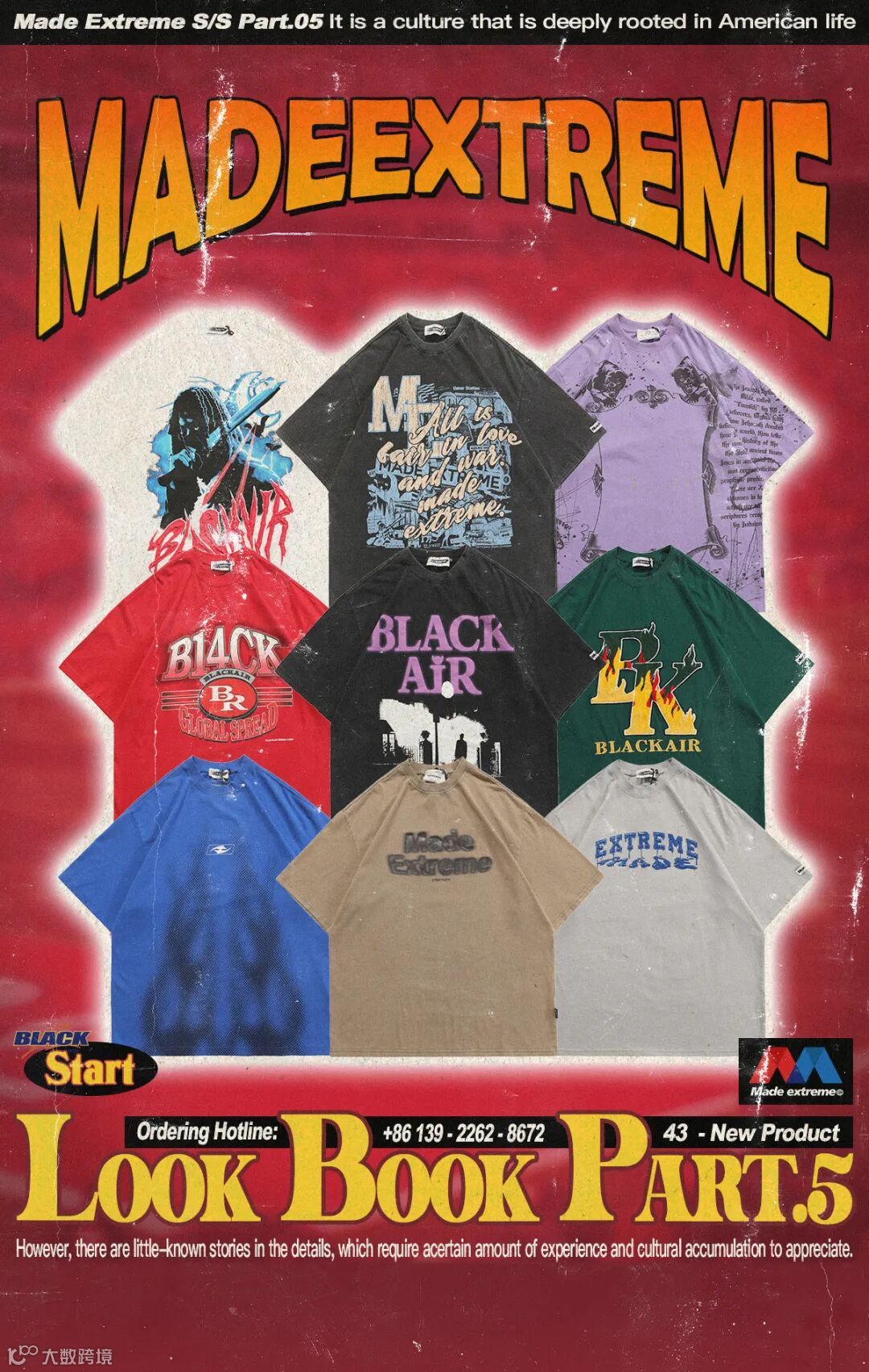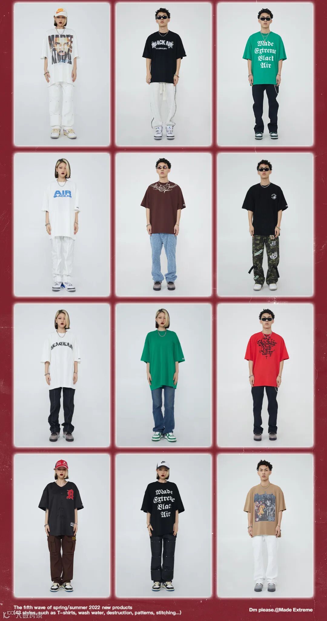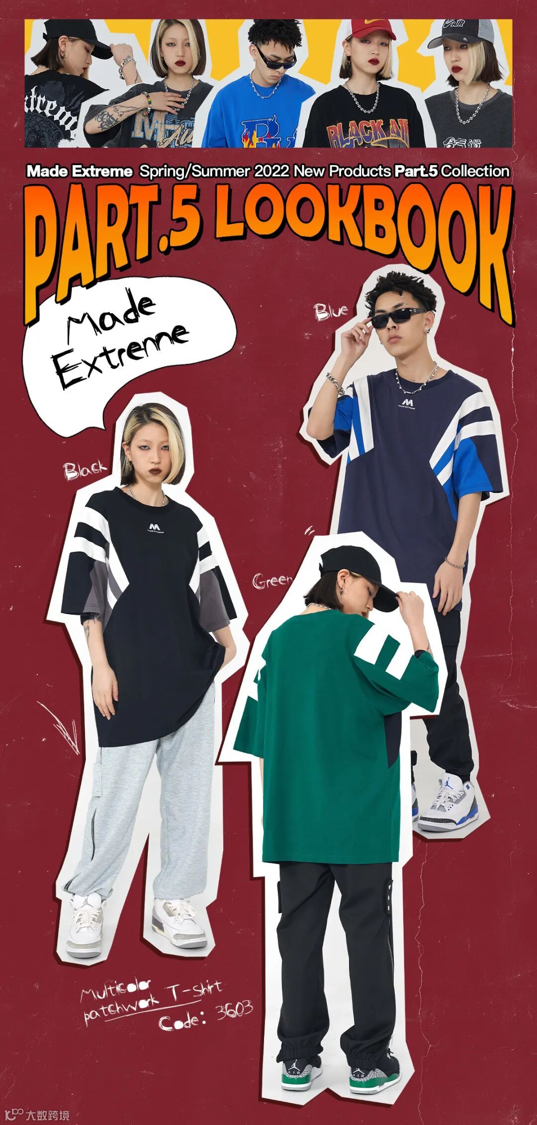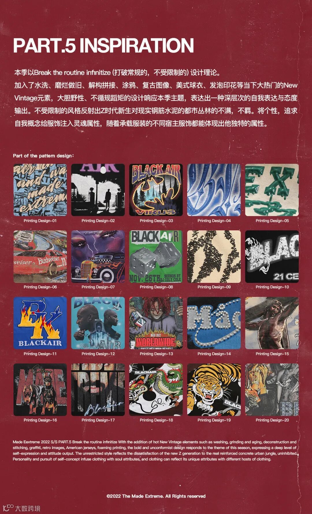 Made Eextreme 2022 S/S PART.5 本季以break the routine infinitize(打破常规的 不受限制的)设计理论,加入了水洗、磨烂做旧、解构拼接、涂鸦、复古图像、美式球衣、发泡印花等当下大热门的 New Vintage 元素,大胆野性、不循规蹈矩的设计响应本季主题,表达出一种深层次的自我表达与态度输出。不受限制的风格反射出Z时代新生对现实钢筋水泥的都市丛林的不满,不羁。将个性,追求自我概念给服饰注入灵魂属性,随着承载服装的不同宿主服饰都能体现出他独特的属性。