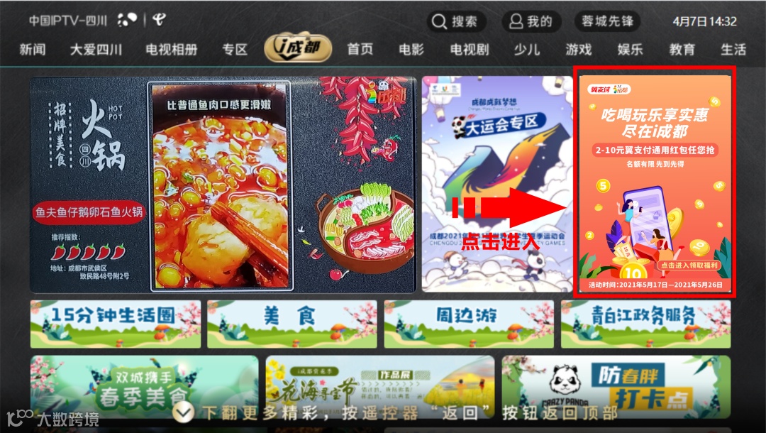 打开电信电视机顶盒→进入电信电视“首页”后 →用机顶盒遥控器选择“i成都”→进入“i成都”专区