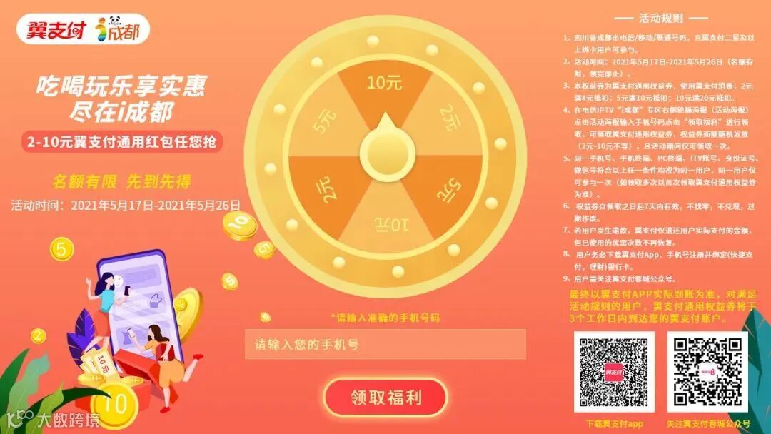 点击活动海报→准确输入您的手机号→随机抢2-10元翼支付通用权益券