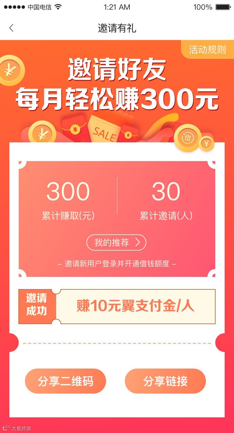 2月21日至3月20日,翼支付绑卡用户在线上渠道(如微信等)分享甜橙借钱H5产品链接,通过专属分享链接每带来一个新用户申请授信,分享者即可获得10元翼支付金,奖励可累加,15天内完成授信才可返利。同一用户(身份证、设备、翼支付账户或手机号)最多享受30户推荐奖励,超出部分不做奖励,每个自然月内限制受30户推荐奖励,下月重置。活动仅限绑卡用户参与,且申请授信的同一身份证只能申请一次。