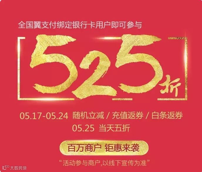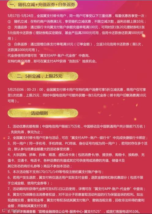 火爆全国的翼支付525活动 新闻速递你要知道 四川除绵阳部分商户外 其余地市商户均不参与525活动 商户是否参与以商户海报宣传为准 【翼支付四川】特此公告!!! 四川用户可在以下合作平台通过翼支付付款参与活动哦, 5月25日6:00-23:00 全国翼支付绑卡用户在活动商户消费可享受5折立减优惠,同一用户仅可享受1次优惠,上限25元,同时中国电信用户可额外获赠一张5元代金券(绑卡用户任意消费满10元可用)详情见下方规则介绍。 规则介绍
