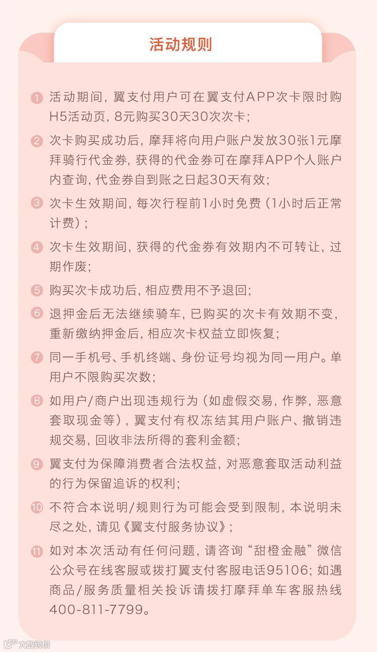 (1)2018年7月,翼支付绑卡用户通过翼支付APP-摩拜,累积骑行1、3、5、10次可领取相应的优惠券奖励,骑行累积次数从7月1日起计算;