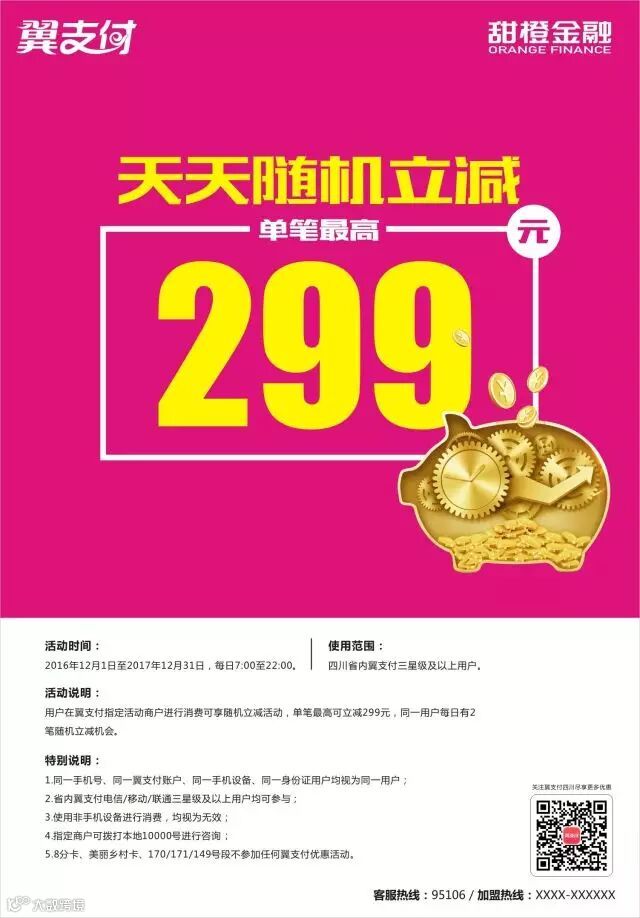 活动说明:用户在翼支付指定活动商户进行消费可享随机立减活动,单笔最高可立减299元,同一用户每日有2笔随机立减机会