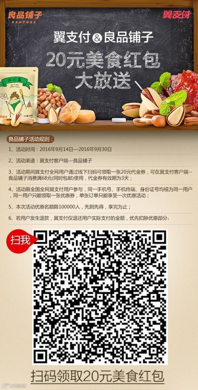 这个秋天让嘴巴跟着良品铺子去旅行,扫码或识别图中的二维码 ,输入翼支付账户即可领取20元良品铺子代金券。