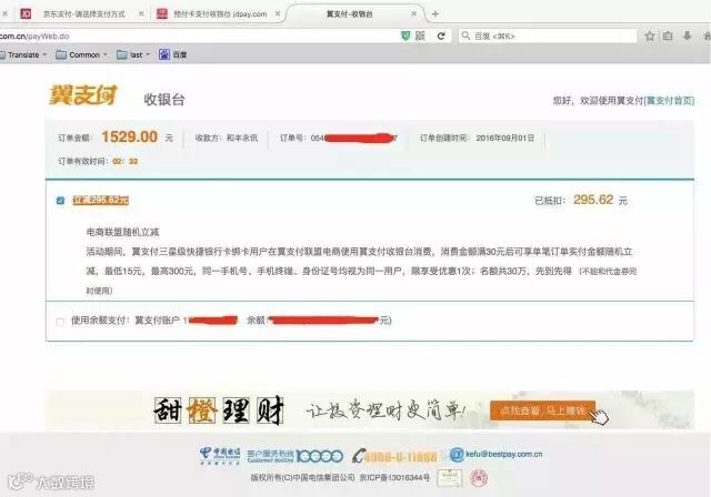 3、活动期间用户在以上活动渠道使用翼支付收银台消费,消费金额满30元后可享单笔订单实付金额随机立减,立减金额15元起,300元封顶;