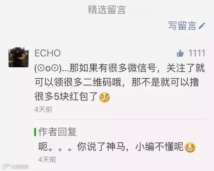 (插个话:之前在“领5元红包,猜数字赢500红包”留言的ECHO不得不在这里表扬一下你机智的头脑)