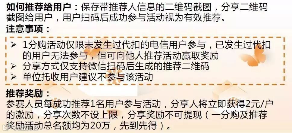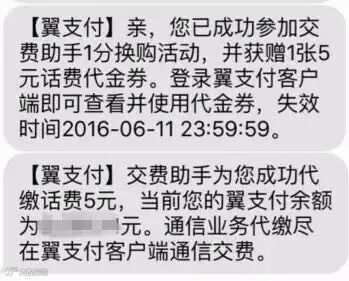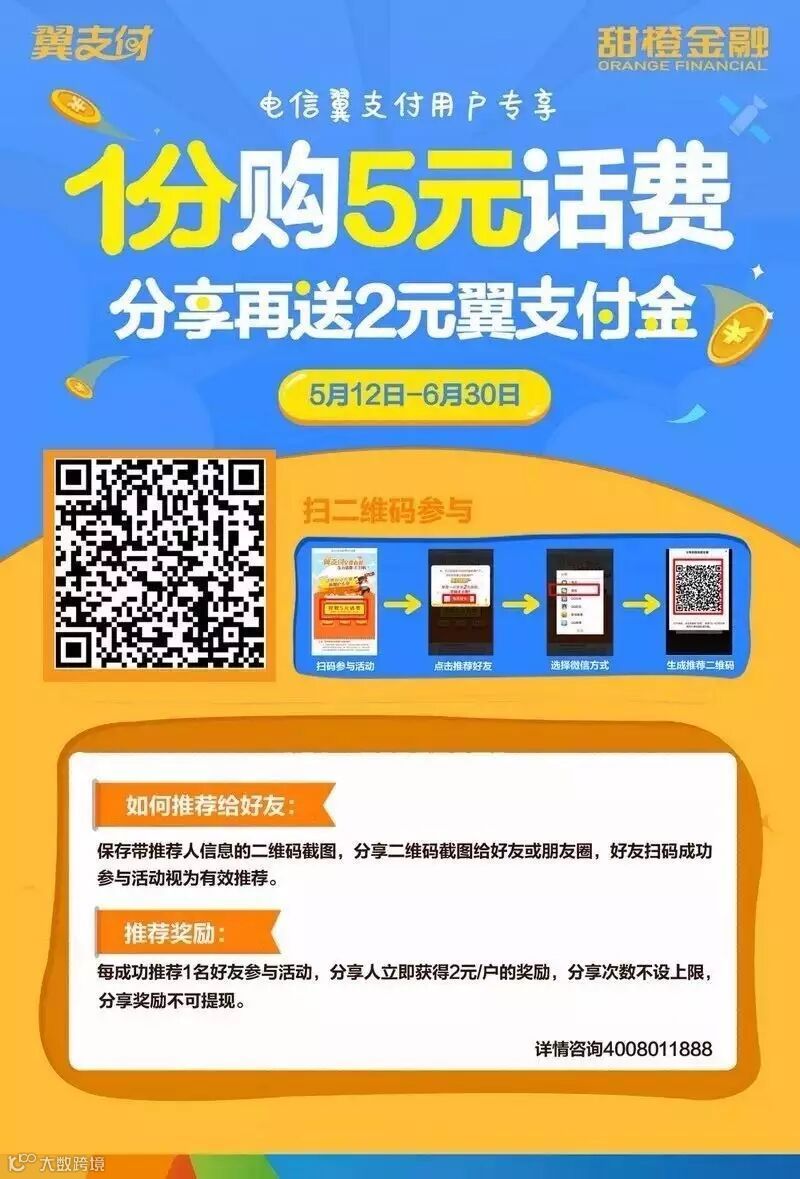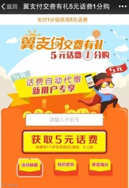 1、每个用户(同一手机号/身份证/翼支付账号均视为同一用户)仅可参与一次“1分购5元话费”活动,但分享推荐不设上限;