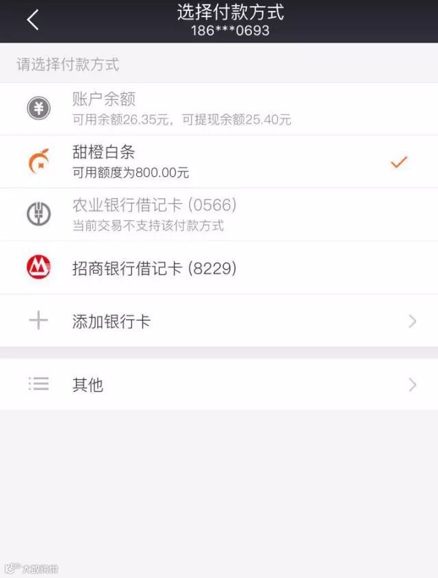 选择“甜橙白条”作为付款方式