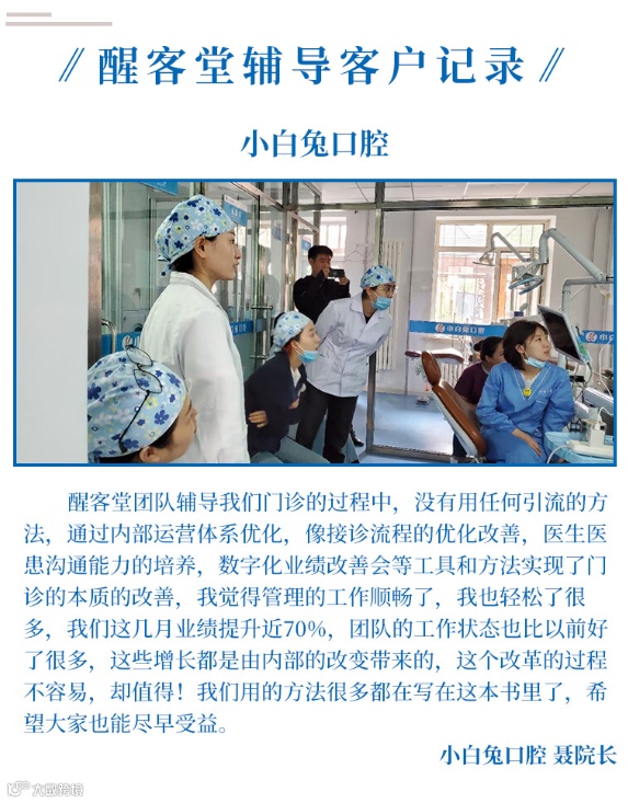 口腔门诊企业的管理者基本都是医生,企业也多是从技术方面对他们进行培养,对于业绩提升的管理投入得太少。殊不知,普通医师与懂得业绩提升管理的医师相比,业绩可以相差数倍。患者接待是细节取胜,做好患者接待和后期维护,形成稳定的可维护的客户群才是长久之道。