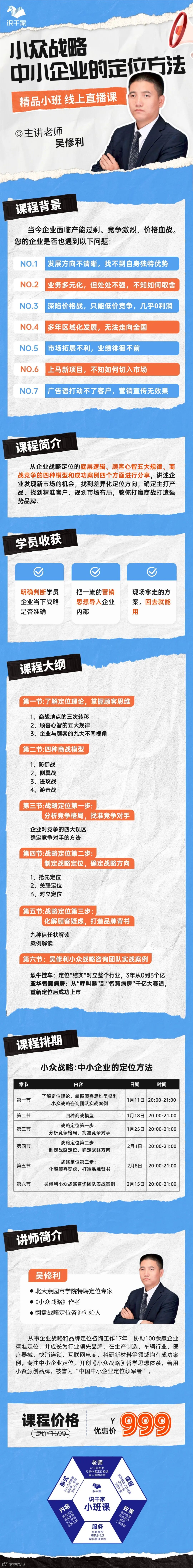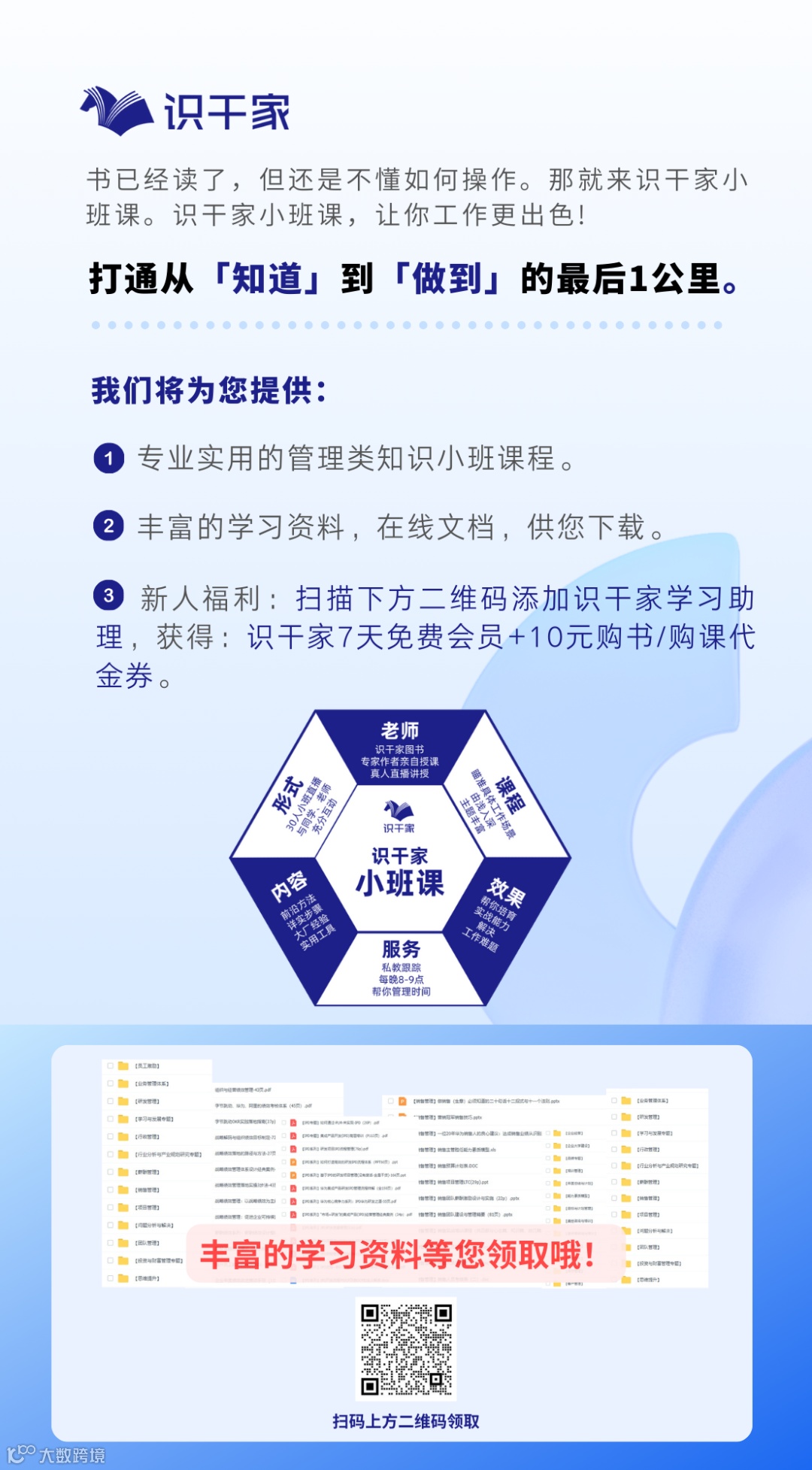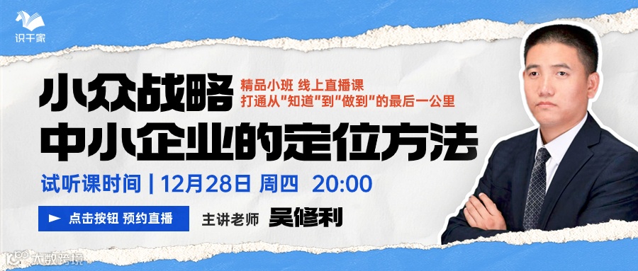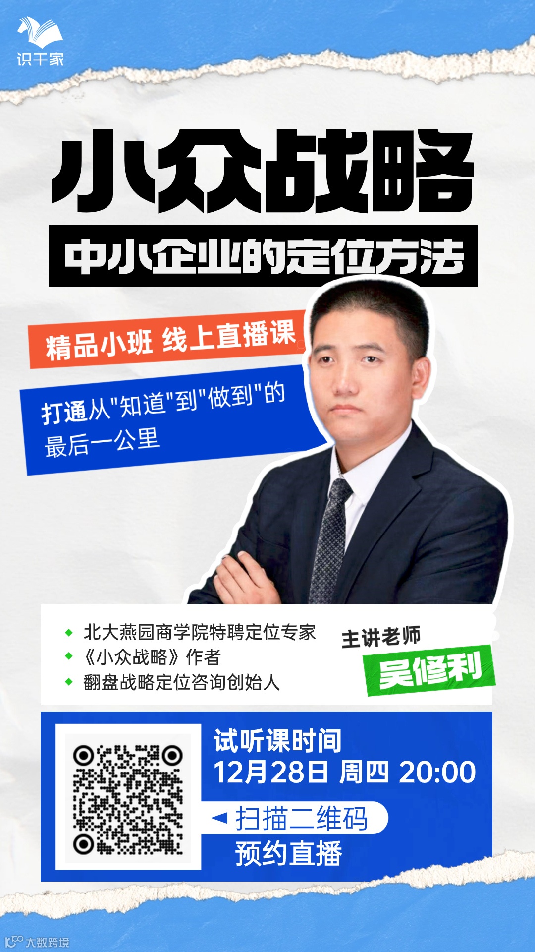 目前我们识干家小班课《小众战略:中小企业定位方法》正在招生,吴修利老师将为大家在线直播授课。现在关注我们并扫码添加识干家学习助理,即可获得更多小众战略规划知识相关学习资料。