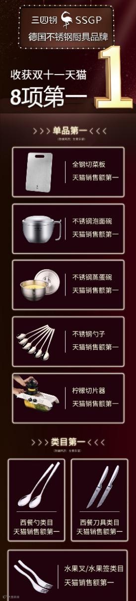 2019年的双十一,三四钢在天猫平台狂揽8项单品销售额第一名的成绩,其中不锈钢菜板连续一年在天猫销量领先,销售额在全网也是稳坐第一位。