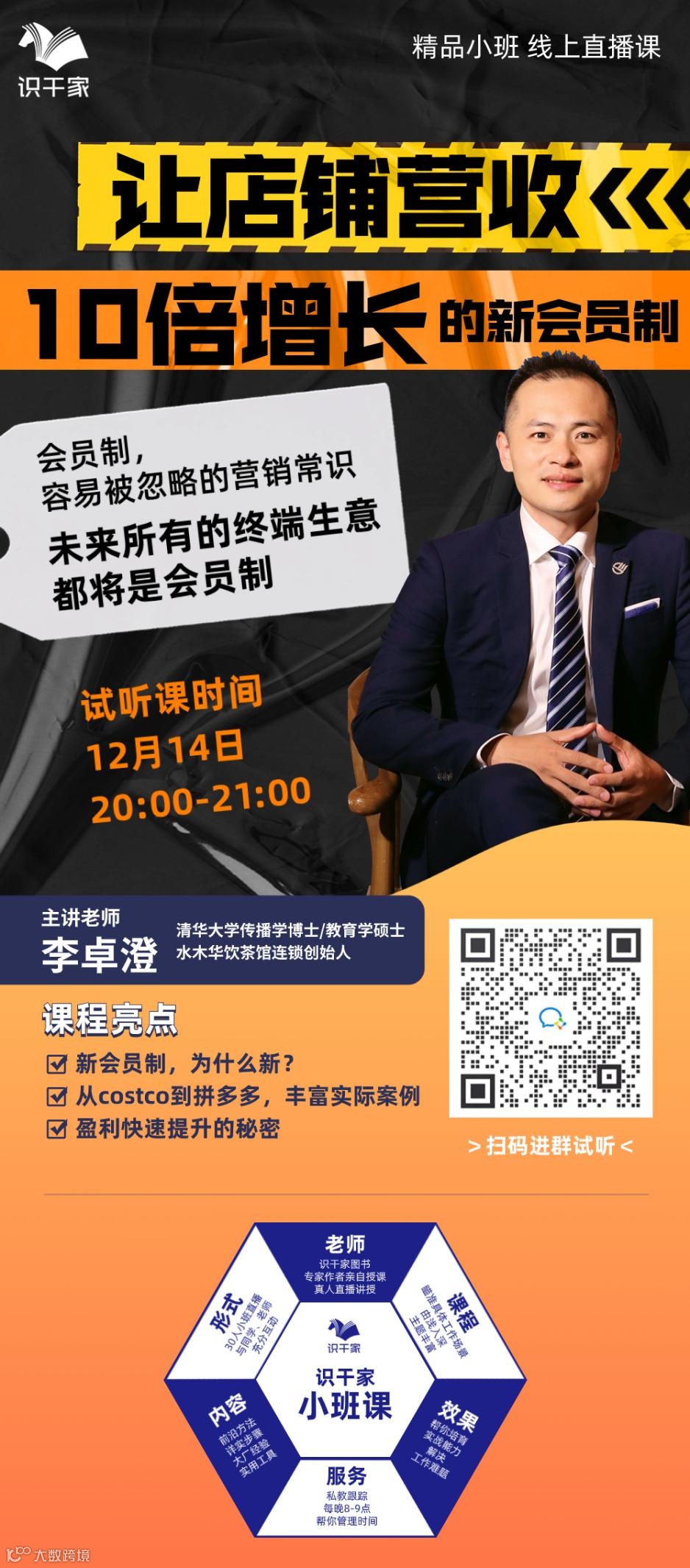 看完这篇文章你是否还想更进一步的学习有关会员制的相关知识呢?那么请关注我们识干家针对让门店实现快速盈利推出了《让店铺营收10倍增长的新会员制》专题小班课,本次课程特邀请到清华大学教育学硕士、华饮(北京)科技股份有限公司董事长李卓澄博士,为大家在线直播授课。现在关注我们并扫码进群,即可获得更多门店与零售知识相关学习资料。