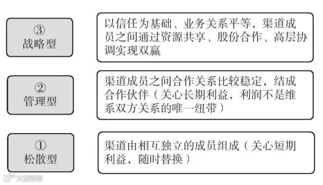 既然渠道和渠道成员是厂家的外部组织,厂商应该建立什么样的关系呢?目前经销商和厂家有三类关系:松散型、管理型、战略型。