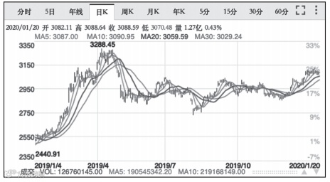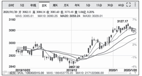 下图是日K线图,如果按照这一视角,你会发现,从2019年12月开始,股市开启了大幅上涨趋势,但到2020年1月13日上涨到了顶部,之后开始下跌。